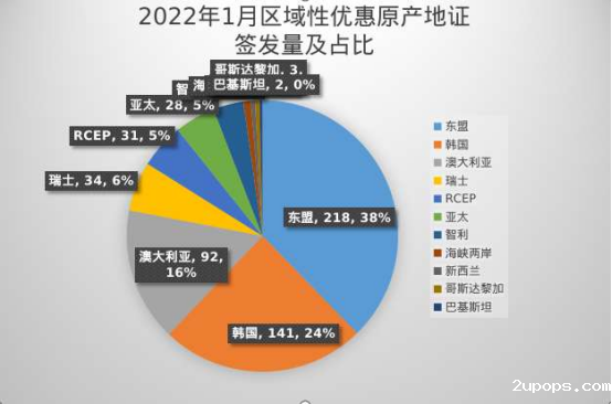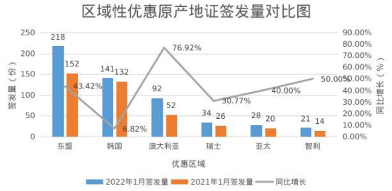 其中,签证量位居前三位的分别是中国-东盟优惠原产地证218份,同比增长43.42%;中国-韩国优惠原产地证141份,同比增长6.82%;中国-澳大利亚优惠原产地证92份,同比增长76.92%。合计451份,占优惠原产地证签证总量的78.03%。