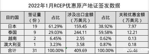 1月1日RCEP正式生效后,我中心为11家企业签发RCEP优惠原产地证31份,涉及出口金额409.69万美元,帮助企业减免进口国关税20.48万美元,出口产品包括食品、化工产品、机电产品、饲料添加剂等。其中,按目的国排序签证量第一的是日本19份,占比61.29%,涉及货物金额159.45万美元,出口产品主要为食品;其次是泰国9份,占比29.03%,涉及货物金额244.11万美元,出口产品主要为化工产品和机电产品。
