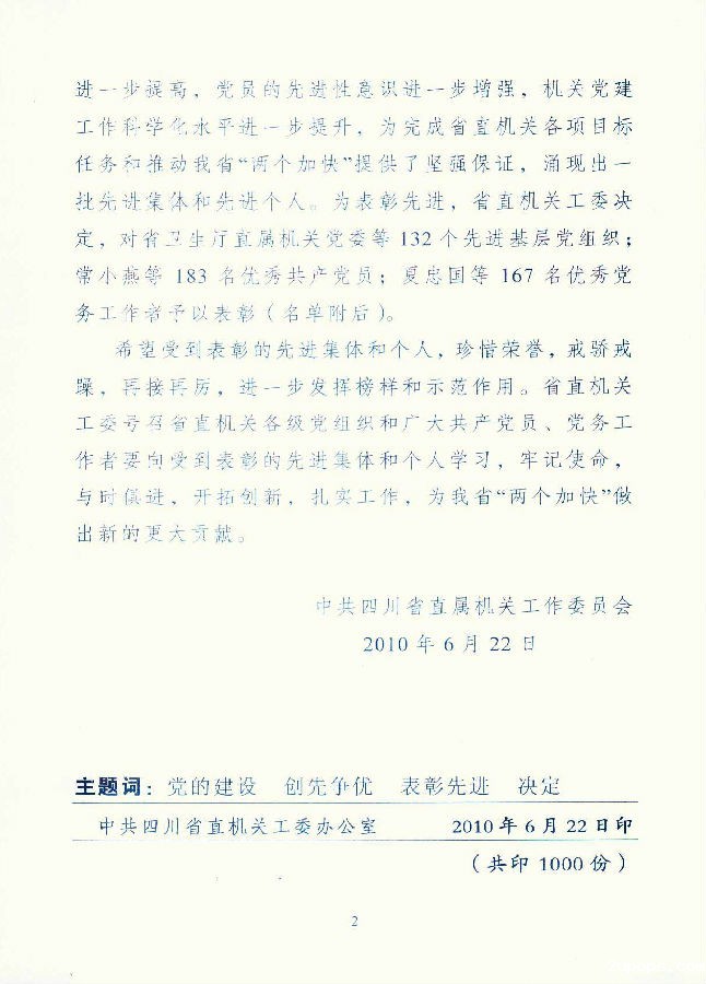 2010年6月25日,“省直机关庆祝建党89周年暨表彰大会”在望江宾馆召开。大会表彰了一批近年来在加强基层党组织建设和推进我省“两个加快”中涌现出来的先进基层党组织、优秀共产党员和优秀党务工作者。我会杨雯怡同志作为优秀共产党员受到了表彰。