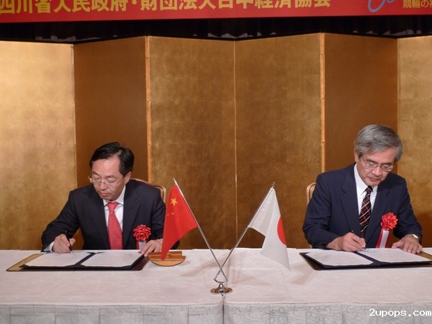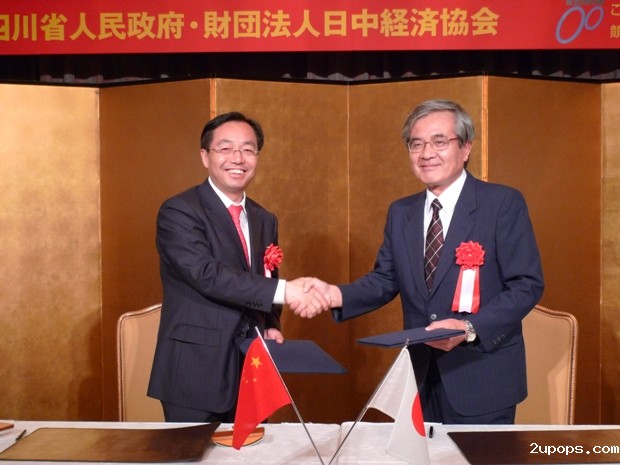 7月5日下午在“2010年中国四川-日本经济合作交流会”上小祥副省长与日中经济协会专务理事稻叶健次共同签署关于加强双方节能减排领域交流合作的备忘录