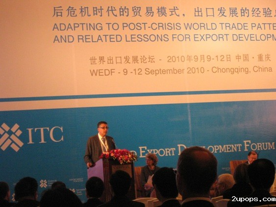 QQ群:6740378232010年9月9日-12日世界出口发展论坛在重庆举行。本次论坛主题为“后危机时代的贸易模式,出口发展经验的总结”,这也是该论坛首次在瑞士蒙特勒以外的国家举办。论坛由联合国国际贸易中心(ITC)、中国贸促会、商务部和重庆市人民政府共同主办。世贸组织总干事帕斯卡尔.拉米、联合国国际贸易中心执行主任帕特里夏.弗朗西斯女士、重庆市委书记薄熙来、市长黄奇帆、国家商务部副部长易小准、中国贸促会副会长王锦珍、中国国际经济交流中心秘书长魏建国、20国集团研究中心秘书长龙永图等出席开幕式,来自全球59个国家和地区的300多名全球行业领袖、贸易扶持机构、贸易促进组织的领导参加论坛。我会王幼平副巡视员应邀出席此次盛会。