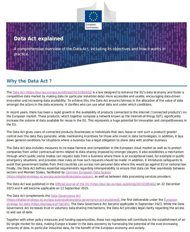 QQ群:674037823近日,欧盟委员会在其官方网站发布了《数据法》(The Data Act)指南,该指南进一步明确了《数据法》实施过程中的各种细节。