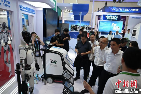 7月17日,北京,中国(绵阳)科技城科技创新产业链展台展出的人形机器人亮相第三届链博会。中新社记者 张浪 摄