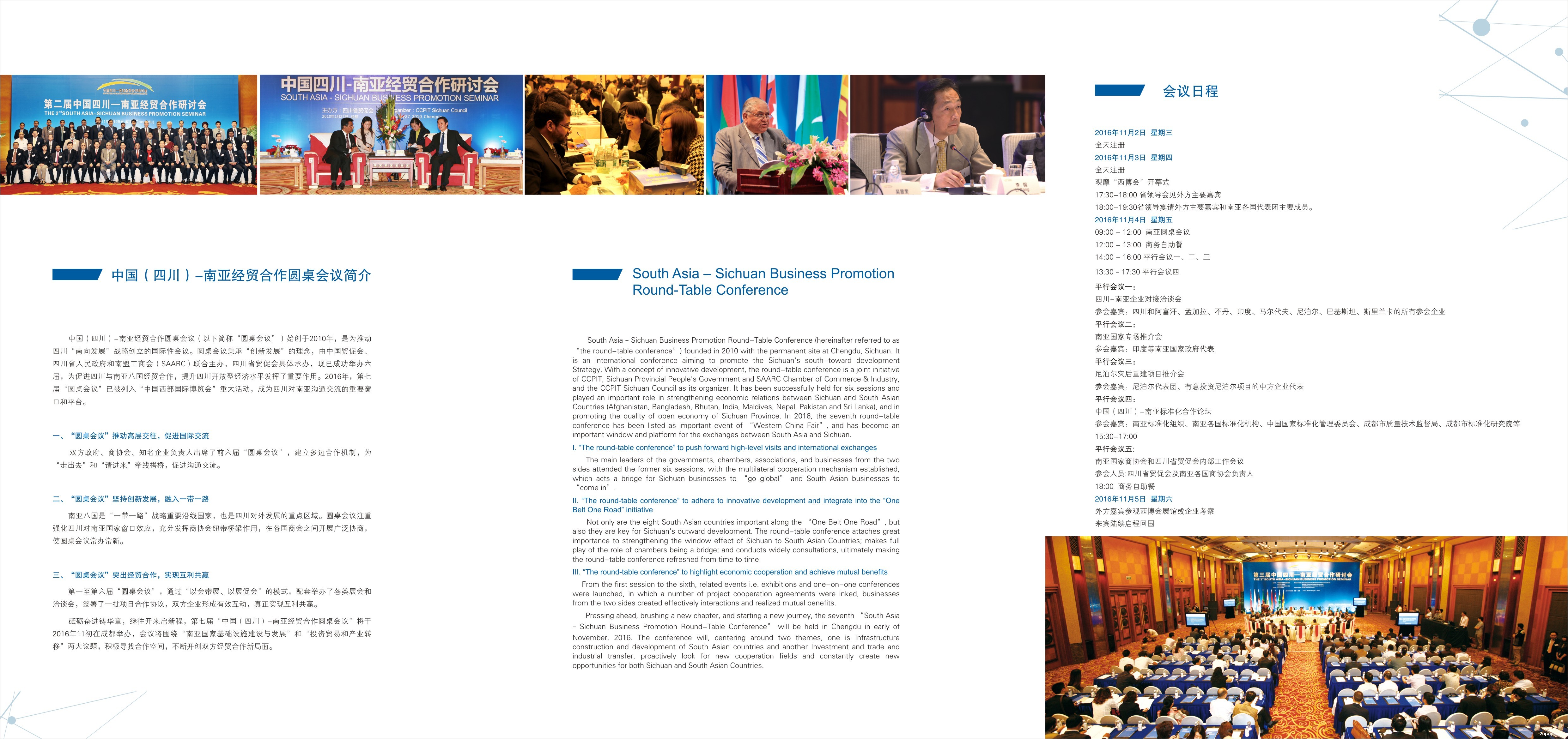 Pressing ahead, brushing a new chapter, and starting a new journey, the seventh “South Asia – Sichuan Business Promotion Round-Table Conference” will be held in Chengdu in early of November, 2016. The conference will, centering around two themes, one is Infrastructure construction and development of South Asian countries and another Investment and trade and industrial transfer, proactively look for new cooperation fields and constantly create new opportunities for both Sichuan and South Asian Countries.