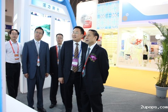 南充市贸促会会长陈家喜同志(右二)陪同副省长陈文华同志(右一)参观南充馆