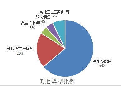 从项目类别看,传统汽车整车及零配件项目44个、投资金额346.7亿元,分别占项目总数和投资总额的64%、46%,仍占据引资的主流部分;新能源汽车及配套项目14个、投资350.78亿元,占比为20%和46.6%,项目数量少金额却最高,体现了产业投资的热点;汽车旅游项目3个、投资金额约11亿元,占比为5%和1.5%,产业链呈现延长趋势;终端销售项目3个、投资金额约3.8亿元,占比为4%和0.5%;其他工业基础项目5个、投资金额41亿元,占比分别为7%和5.4%。