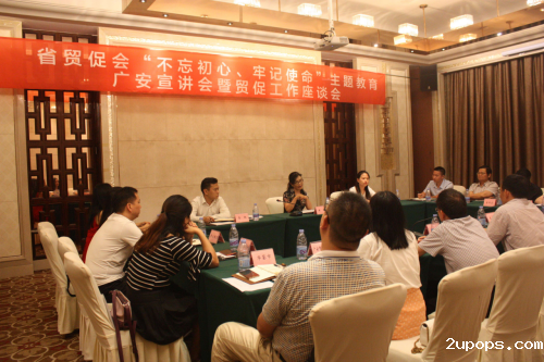 在“不忘初心、牢记使命”主题教育广安宣讲会暨贸促工作座谈会上,黄莉从“缅怀伟人功绩、增强‘四个自信’”“民本情怀、致力为民造福”“牢记公仆意识、勇于担当作为”三个方面讲党课。并同广安市贸促会、市经信局以及各区县贸促机构围绕贸促系统改革、智博会筹备、“万企出国门”活动组织等开展深入交流。黄莉指出,广安贸促系统围绕职能职责开展了一系列卓有成效的工作。她要求广安贸促系统借助深化改革的机遇,进一步理清贸促体制机制;做好展会等重大活动的跟踪问效工作;加强企业和市场调研,搞好需求对接;同时,抓紧落实我会目前开展的智博会、世园会“四川日”等重大活动。