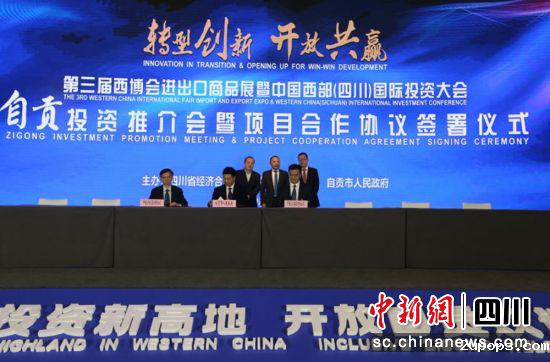 QQ群:6740378232019年9月19日下午,第三届西博会进出口商品展暨中国西部(四川)国际投资大会自贡投资推介会在成都举行。自贡市向国内外投资商推介了转型升级新机遇和开放发展新举措,共签约50个重大项目,涉及航空与燃机、新材料、节能环保、现代服务业等领域,投资总额388亿元,开启了合作共赢的新天地。