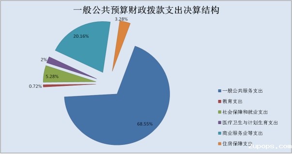 2019年一般公共预算财政拨款支出2643.6万元,主要用于以下方面:一般公共服务(类)支出1812.15万元,占68.55%;教育支出(类)19.14万元,占0.72%;社会保障和就业(类)支出139.67万元,占5.28%;卫生健康支出52.92万元,占2%;住房保障支出86.73万元,占3.28%;商业服务业等支出533万元,占20.16%。