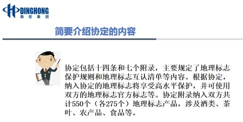 (2)“100+100”:该协定谈判于2011年启动,共历时8年,于2019年底,中欧双方宣布结束谈判。双方互认的各100个地理标志于协定生效之日起开始保护。