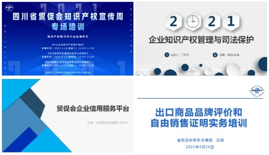 4月20日、22日、26日,围绕中小企业知识产权保护,从企业知识产权管理、品牌管理、信用体系建设、文化建设、纠纷解决、司法保护等方面,举办“企业知识产权管理与司法保护”“企业信用体系建设及信用认证培训”和“出口商品品牌评价和自由销售证明实务培训”3场线上培训,外向型企业代表、贸促系统工作人员等300余人参训。