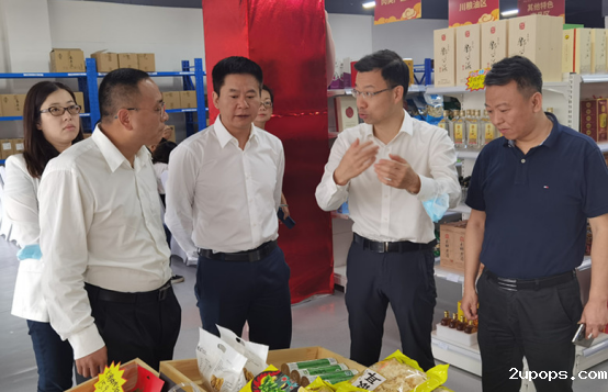 优米365App副会长范军(中)、广州市贸促会主任杨勇(右二)参观遇见四川·川货精品国际融合共享云展购展厅