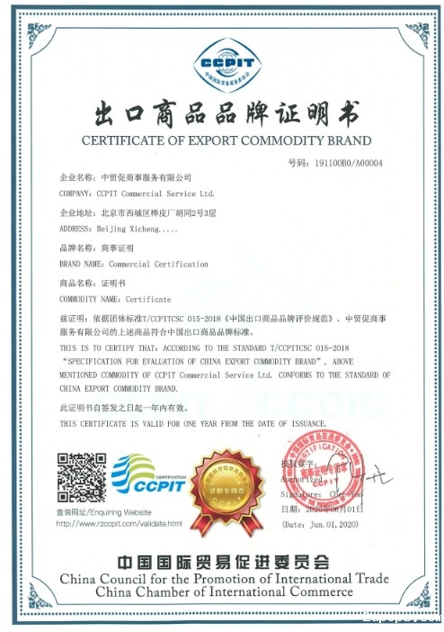 为配合国家品牌战略、标准化战略的实施,更好地引导企业增强品牌意识,提升品牌管理能力,实现从产品经营向品牌经营转变,中国贸促会商事认证中心联合中国国际贸易促进委员会商业行业委员会推出中国出口商品品牌评价业务。以“标准化+商事认证+贸易促进”新模式助力出口型企业品牌建设。由中国国际贸易促进委员会商业行业委员会依据《“中国出口商品品牌评价规范”T/CCPITCSC 015-2018团体标准》出具评价报告,中国贸促会及授权地方贸促会、行业贸促会根据评价报告为达标企业出具《中国出口商品品牌证明书》,获证企业可以在其出口商品上加贴我会推荐认证标识。