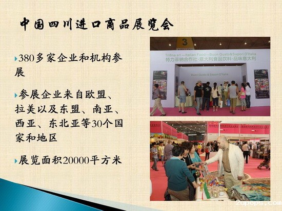 一是通过举办“中国四川进口商品展览会”来促进贸易。今年有来自欧盟、拉美以及东盟、南亚、西亚、东北亚等30个国家和地区的380多家企业和机构参展,展览面积20000平方米。
