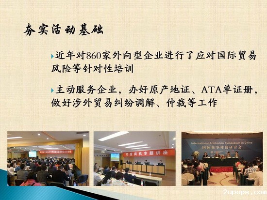 (一)夯实活动基础。一方面,近年对860家外向型企业进行了应对国际贸易风险等针对性培训。另一方面,主动服务企业,办好原产地证、ATA单证册,做好涉外贸易纠纷调解、仲裁等工作。