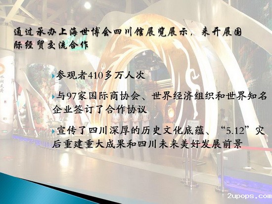(一)通过承办上海世博会四川馆展览展示,来开展国际经贸交流合作。2010年上海世博会四川馆展览展示等工作由我会牵头负责。我们通过精心策划、精心设计和精心组织,四川馆共接待参观者410多万人次。通过世博会平台,与97家国际商协会、世界经济组织和世界知名企业签订了合作协议。同时,有力地宣传了四川深厚的历史文化底蕴、“5.12”灾后重建重大成果和四川未来美好发展前景。