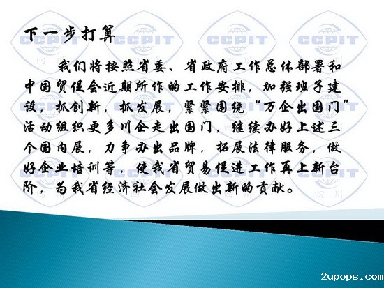 我们将按照省委、省政府工作总体部署和中国贸促会近期所作的工作安排,加强领导班子建设,抓创新,抓发展,紧紧围绕“万企出国门”活动组织更多川企走出国门,继续办好上述三个国内展,力争办出品牌,拓展法律服务,做好企业培训等,使我省贸易促进工作再上新台阶,为我省经济社会发展做出新的贡献。