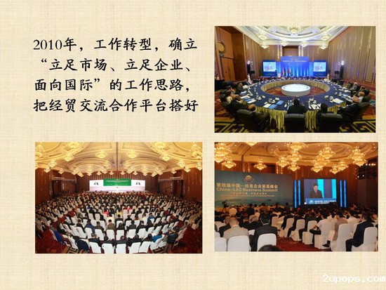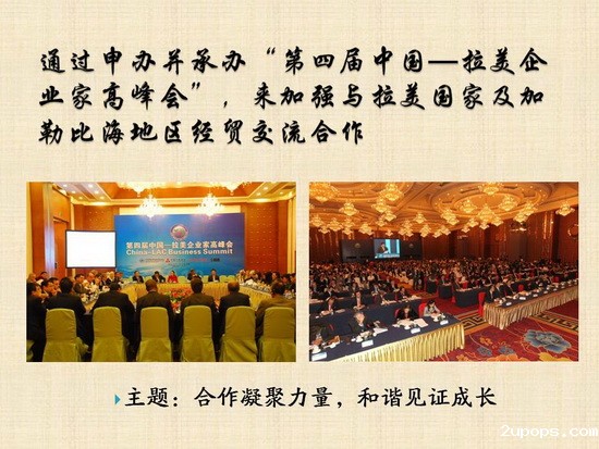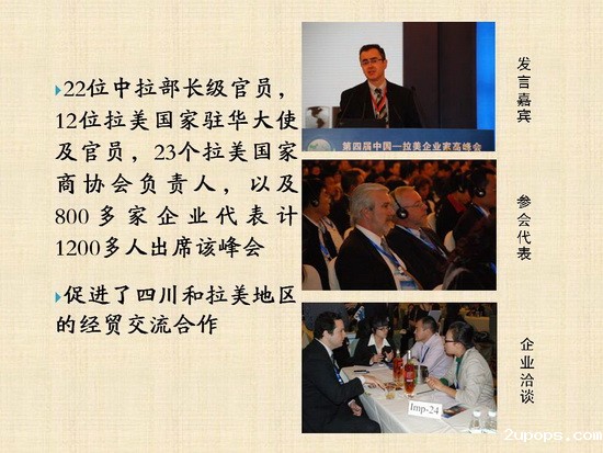 (二)通过申办并承办“第四届中国—拉美企业家高峰会”,来加强与拉美国家及加勒比海地区经贸交流合作。2009年,我会向组委会成功申办2010年10月在成都举办第四届。高峰会以“合作凝聚力量,和谐见证成长”为主题。有22位中拉部长级官员,12位拉美国家驻华大使及官员, 23个拉美国家商协会的负责人,以及来自矿业、航空航天、汽车、能源、金融等14个行业的800多家企业代表计1200多人出席了该峰会。通过举办该峰会,有力地促进了四川和拉美地区的经贸交流和合作。