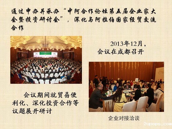 (三)通过申办并承办 “中阿合作论坛第五届企业家大会暨投资研讨会”,深化与阿拉伯国家经贸交流合作。2013年12月,“中阿合作论坛第五届企业家大会暨投资研讨会”在成都召开。会议期间就贸易便利化、深化投资合作等议题展开研讨。中阿企业进行了项目对接和合作。