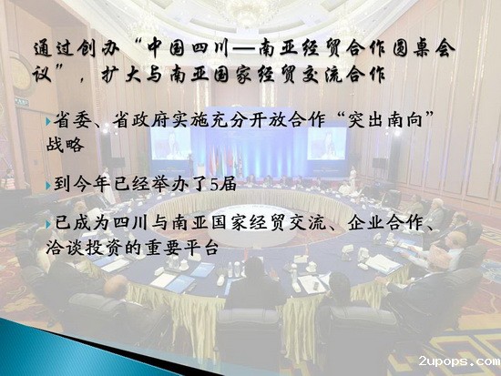 (四)通过创办“中国四川—南亚经贸合作圆桌会议”,扩大与南亚国家经贸交流合作。我们认真贯彻省委、省政府实施充分开放合作“突出南向”战略,创办了“中国(四川)—南亚经贸合作圆桌会议”。到今年已经举办了5届。该圆桌会已成为四川与南亚国家经贸交流、企业合作、洽谈投资的重要平台。