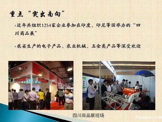 (二)重点“突出南向”。近年来,共组织1254家企业在印度、印尼等南亚、东南亚国家举办“四川商品展”。我省生产的电子产品、农业机械、五金类产品等深受欢迎。