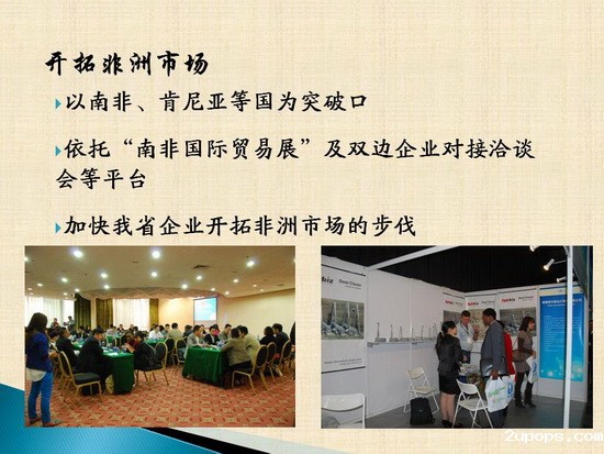 (五)开拓非洲市场。我们以南非、肯尼亚等国为突破口,依托“南非国际贸易展”、双边企业对接洽谈会等平台,加快我省企业开拓非洲市场的步伐。