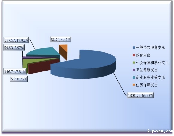 2020年一般公共预算财政拨款支出2006.5万元,主要用于以下方面:一般公共服务(类)支出1308.42万元,占65.23%;教育支出(类)5.2万元,占0.26%;科学技术(类)支出0万元,占0%;文化旅游体育与传媒(类)支出0万元,占0%;社会保障和就业(类)支出146.74万元,占7.31%;卫生健康支出59.53万元,占2.97%;住房保障支出88.74万元,占4.42%;商业服务业等支出397.57万元,占19.81%。